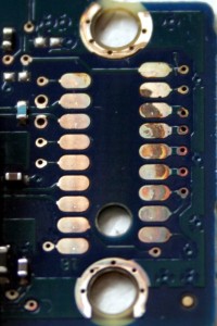 Na początku sprawdziłem styki od wtyku na elektronice dysku w poszukiwaniu zimnych lub pękniętych lutów. Ponieważ styki te były w porządku to wykręciłem elektronikę dysku i sprawdziłem styki łączące ją z elektroniką wewnętrzną dysku. Moje podejrzenia okazały się prawidłowe - styki były zaśniedziałe. Psiknąłem na nie Kontaktem S, który składa się głównie z izoproponolu oraz nafty, po czym przetarłem kilkakrotnie styki chusteczką i wyczyściłem wszystko izopropanolem.